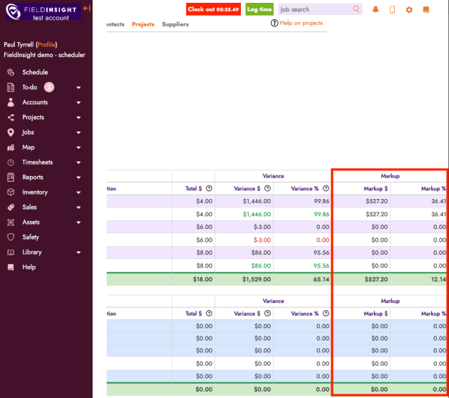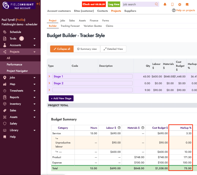 The Budget Summary now includes a Markup Percentage (%) column alongside the existing markup values.