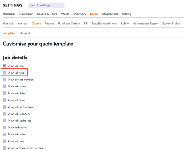 Sales documents now have an option to include the related Job Type. When creating a sales document, you can choose to show the job type on that document.