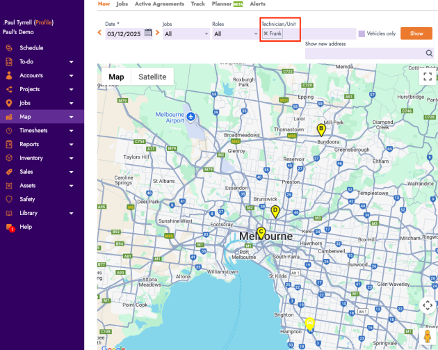 In Map → Now, when you select a technician who shares jobs with others, the map now shows that technician’s own path in their colour with ordered markers (A, B, C, etc.) based on job time.