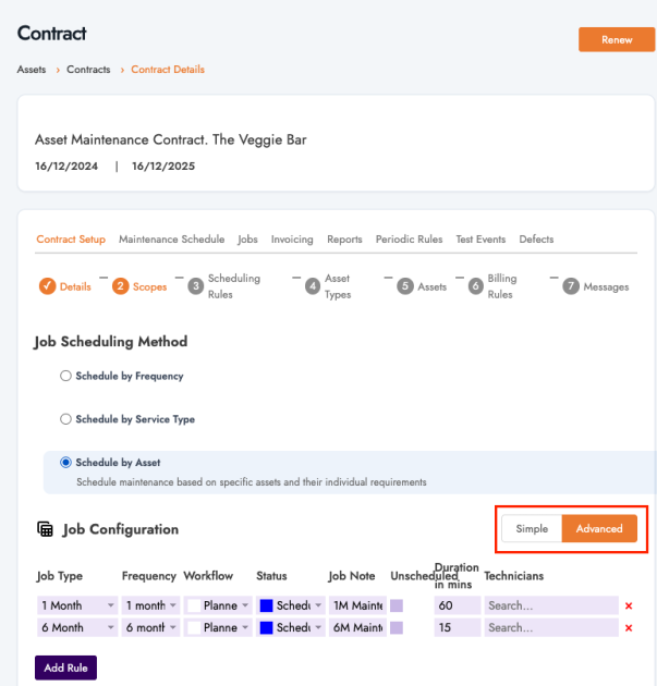 Job Rules now include a Simple / Advanced toggle. Simple mode hides advanced options; Advanced mode shows all fields such as detailed duration, schedule, and frequency.