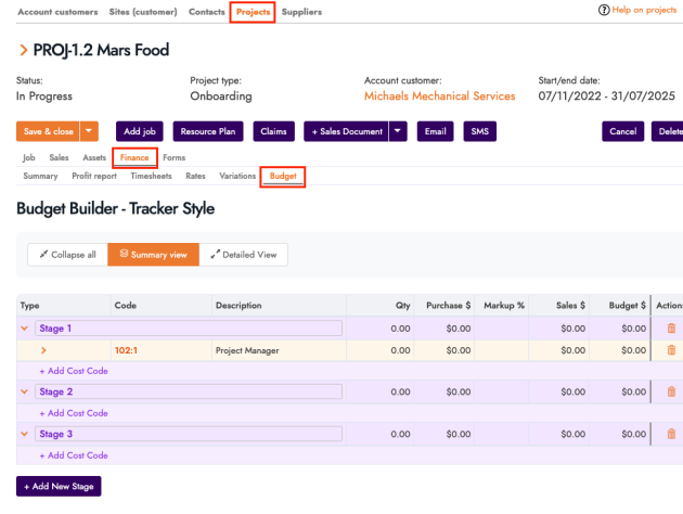 A new Project Budget tab is available under Project → Finance → Budget. You can build budgets using stages, cost codes, and line items based on inventory. Cost Codes and Cost Centres are configured in Settings and used inside the Budget Builder only (they are not yet linked to other areas of FieldInsight).