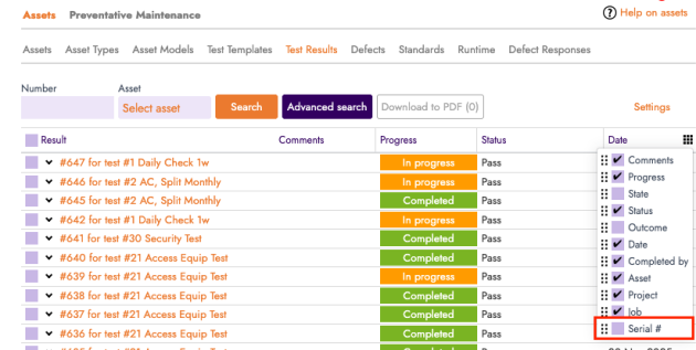 Assets — Serial Number on Test Results List