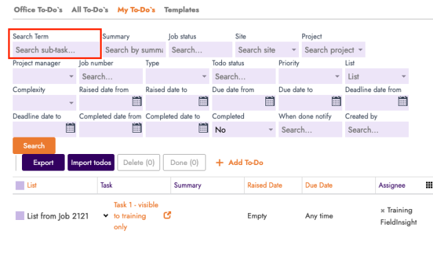 A new keyword search bar is now available in All To-Dos and My To-Dos, allowing searching by name, description, or summary.
