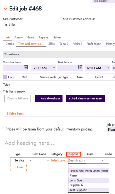 An optional Supplier column can be shown on Job Time & Materials, positioned before Category. It displays the Supplier Name linked to each product in your Inventory List.