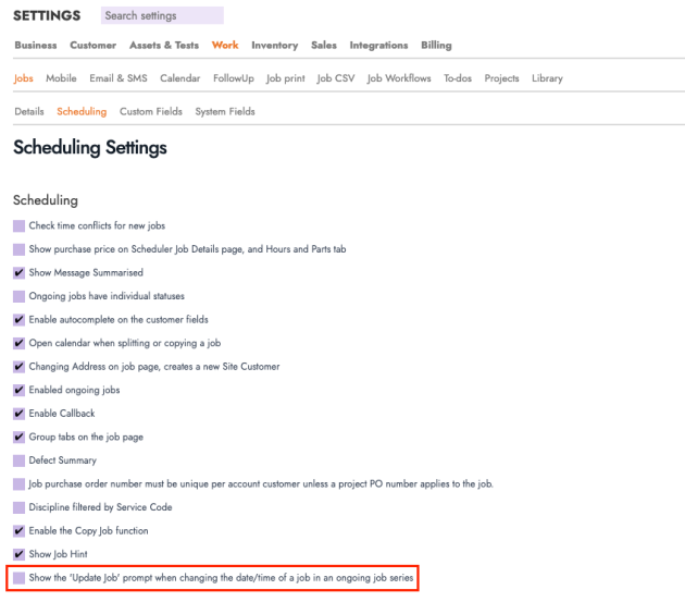 A new setting controls whether to show the “Update Job” prompt when you change the date/time on a job that’s part of an ongoing series.