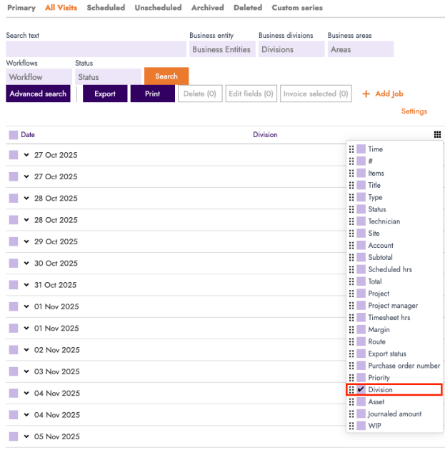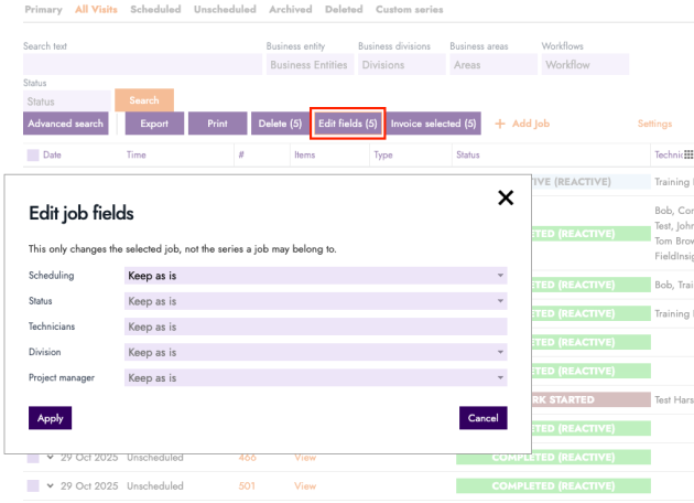 The bulk-update tools are consolidated: select jobs in the list and update Status, Technicians, Division, Project Manager in one action.