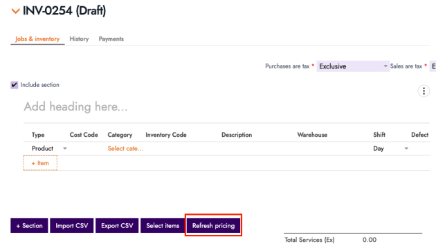 Next to Select Items, there’s a Refresh Pricing button that rewrites line prices from the current Item Code pricing (sales & purchase).