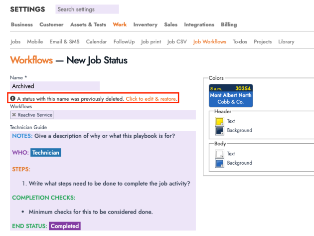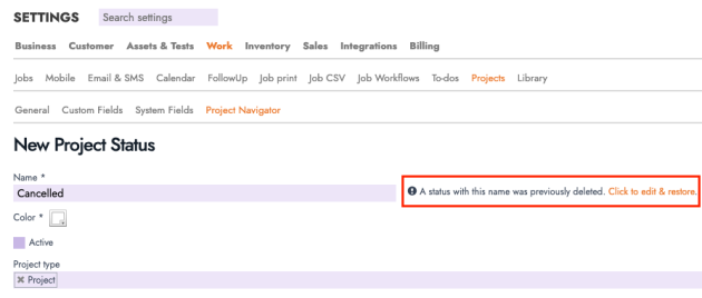 If you try to add a status that exists in Deleted, we’ll prompt you to restore it (with previous field values) for Projects and Jobs.