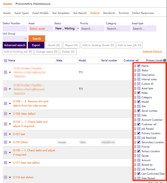 You can now show Last Confirmed Date and pick more columns via the 9-dot menu: Make, Model, Serial Number, Customer Ref, Location (Primary/Secondary/Tertiary).
