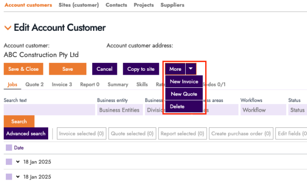 A new More button adds New Invoice, New Quote, and Delete actions into this menu.
