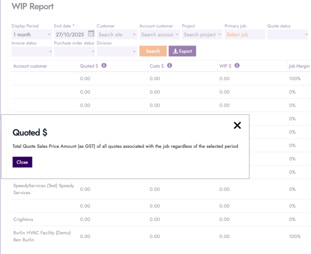 When a column has help, the header cursor becomes a question mark. Click to open an info dialog with formula, description, example, and dependencies.