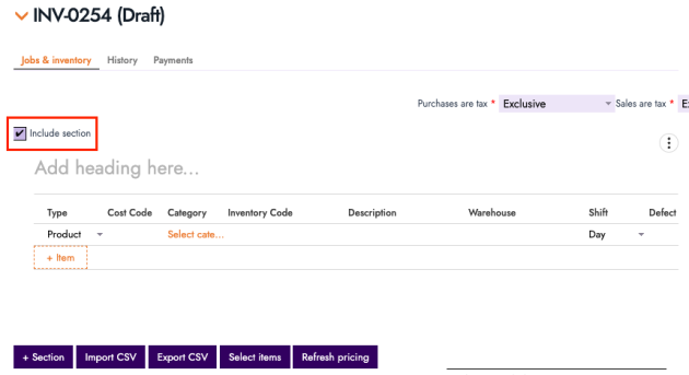 Added the text “Include section” beside the section checkbox on quotes and related documents.
